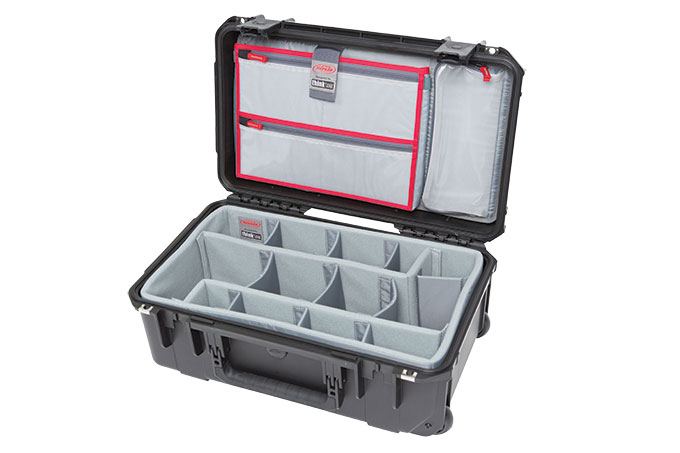 Approved for airline carry-on but tough enough to endure being checked in, this SKB hard case features Think Tank dividers and a lid organizer. The rolling case is dustproof and watertight. The interior features a Nylex-wrapped, closed-cell fitted foam liner and ten nylon dividers with heavy-duty hook-and-loop tabs. The lid organizer includes laminated clear mesh pockets and a polyester-lined iPad/laptop top-loading pocket.