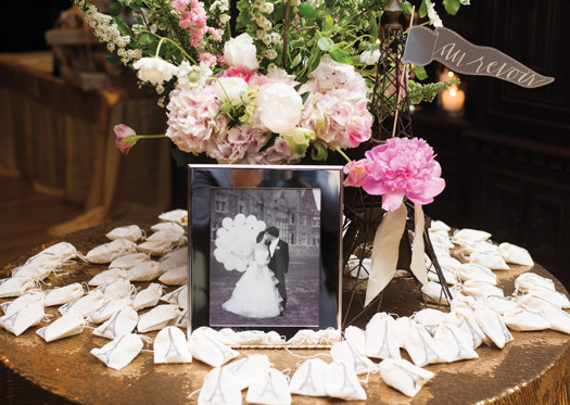 The Marantzes add that the bride and groom usually place the frame on their gift/guest book table to show it off, snap a photo of it with their smartphone, and post a message on social media with the hashtag Justin & Mary #bestphotographersever. “It makes such a great impression for any of their friends who are getting married,” says Mary, especially “when everyone is dying to see pictures right then and there.” The silver-plated frames the Marantzes use from Restoration Hardware are available in several sizes from 4 x 6 inches to 8 x 10 inches.