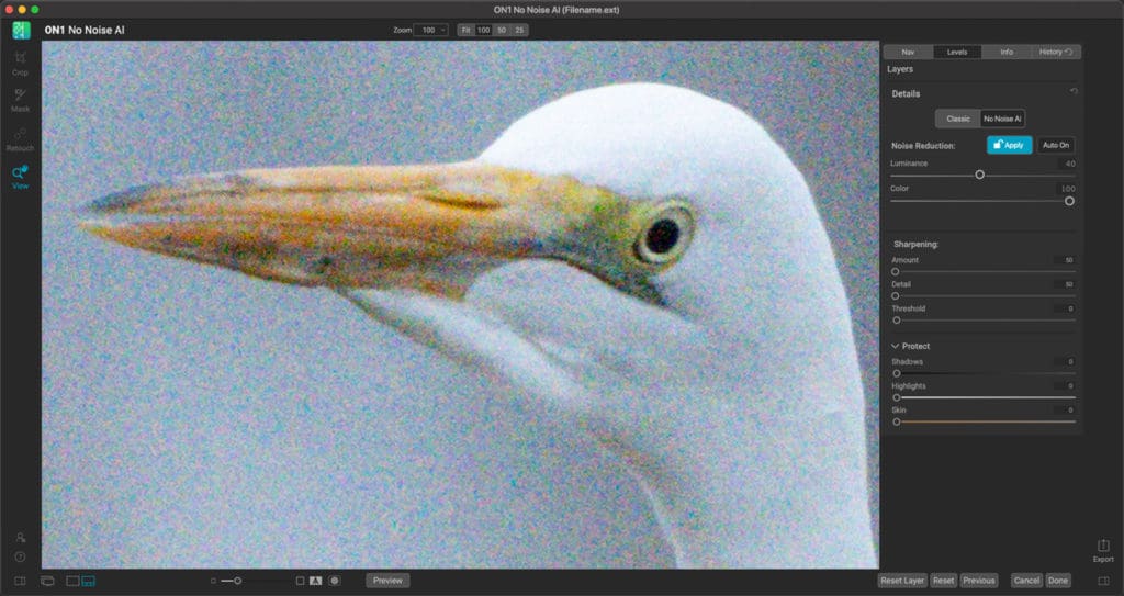- Auto button with user preferences: The Auto button in ON1 NoNoise AI will analyze a photo and determine the correct amount of noise reduction using AI models. Customer preference will also be considered, such as whether the user wants to maintain some grain in an photo or not.