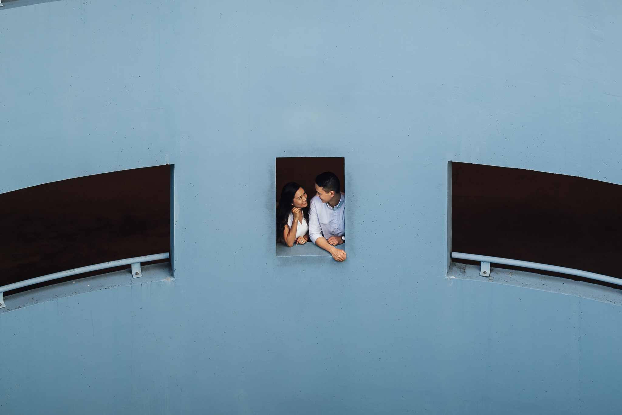 “I gravitate towards buildings with clean lines, symmetry and architecturally aesthetic backdrops,” Le says, so when he’s shooting engagement or wedding sessions, he tries to incorporate these elements into his work as well. For this portrait, Le avoided the urge to shoot wide like he’s done in the past (you can see his previous portraits in this location here and here) and instead provided a more macro perspective of the blue structure. “It can be challenging to provide a fresh take on a highly photographed location, so I used a longer lens this time to scan for the best composition, as opposed to using the standard wide-angle lens,” he explains.