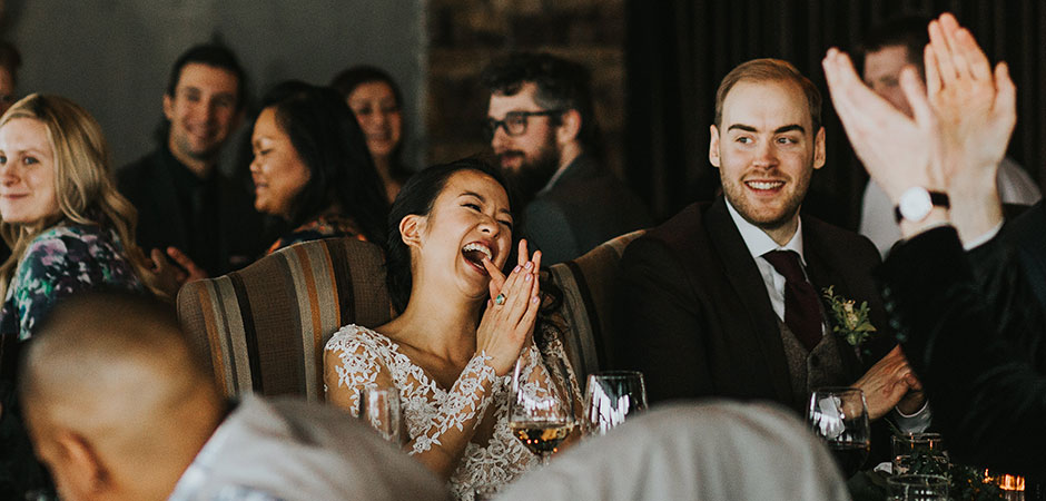 This bride couldn’t contain her laughter during the father-of-the-bride speech at her Calgary, Canada-based wedding. “He was so funny that even I was laughing behind my camera,” says photographer Lisa Patey of Mint Photography.