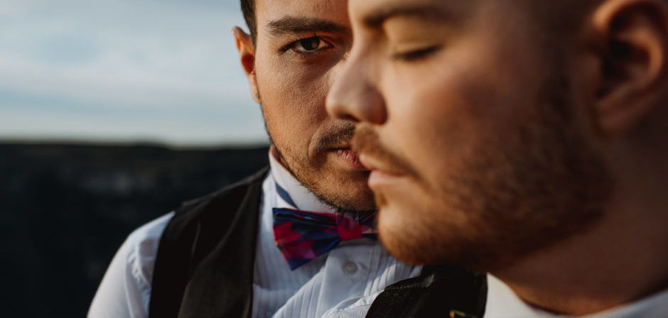Once the framing was on point, Radici asked the couple to endulge him in a few tweaks: eyes open, eyes closed and pivoting slightly to get the light in the surrounding Fortaleza Canyon to hit them just right. “This portrait with one groom having open eyes pleases me most,” Radici says. “I really like the symmetry of their nose and eyes. I like the lines they form and the hard look straight at the camera. It provides a beautiful contrast between softness and stiffness.”