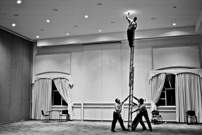 One day, we were shooting a wedding at a Cancun all-inclusive venue. Tamara and I arrived early and went to check out the location for the reception. I walked into a ballroom and saw a scene that I will never forget. I found a group of three men holding a ladder with a fourth man standing at the top of it, changing a light bulb. The ceiling was at least 6m (20ft) high! I wasn’t even ready to start shooting, but I took the picture. My aperture was only F2.2 and my shutter speed was 100. These are very risky settings for almost any situation.