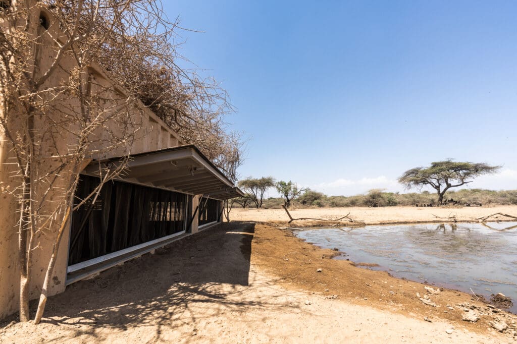 The first water was brought to the hole by pickup trucks in December of 2021. Eventually, the team employed 30 people from the local Maasai community to build a 5 km. pipeline that would feed the hole using a solar pump. Two shipping containers were converted into a hide that includes a bathroom and folding beds. The hide was partially buried in the ground to place the viewing windows just above the water.