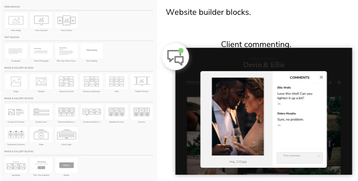 The photo business platform makes it easy for Helt to update her portfolio website, since ProSuite offers a raft of features and services that she can add just by dragging and dropping. “I love that you’re able to fully customize everything,” she says. “They have really beautiful options, and now they even have video. In galleries, clients are able to choose their favorites and download them. I can see what they do behind the scenes, and they can make comments, on images. If there’s anything else they want me to edit, they can comment and I can fix it up and pop it right back in.”