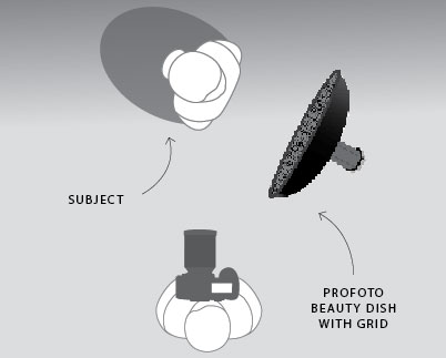 I started by placing a beauty dish with a grid to light her face and torso, which created focus and glowing light on my subject without allowing the main light to spill everywhere. Because I would be adding gels, I didn’t want to overpower the scene with light. Gels show up better in shadow areas, so the beauty dish grid allowed me to concentrate the main light and therefore make the gels appear more pronounced and richer in color.