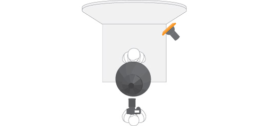 For the background, Zach took an overhead light set to two stops below the f/11 key light at f/5.6. “It’s shooting through a 7-inch reflector and a 20-degree grid, so it gives a vignette look,” he says. Although the backdrop was actually blue-gray, Zach put an orange tungsten (half CTO) gel over the light to match the warmth of the model’s headband.