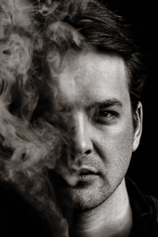 Zach enlisted his actor/musician friend Jason Bynum as his subject for the sole purpose of creating personal work to keep his portfolio fresh. With Bynum positioned in front of a gray seamless background set up in the Gray’s garage, Zach says he was going for a split-lighting look with ”a gritty, textured skin tone and cool, ethereal smoke effect.”
