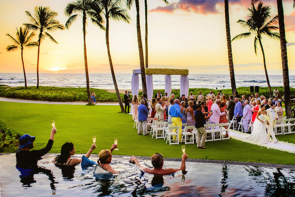 Designate one of you to be the “aisle person” who photographs the processional and gets all the moments. The other person should be the risk taker. If you’re in the latter position, shoot from the roof, a balcony, from inside a window, and from vantage points no one would expect. If the risks don’t work out, you’re still safe because the key moments have been covered. However, more often than not, your risks will pay off big-time, so go for it! (Note: It’s okay to switch positions—just always watch the other shooter and fill in where you need to.)
