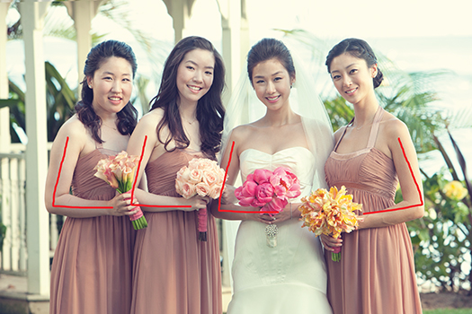 The concept of mirroring does not apply just to feet, hands and arms. It includes heads and torsos as well. Notice how all the bodies and heads of the guests face the same direction. Except for their faces, they are almost replicas of each other. The bride is the only one positioned a bit differently.
