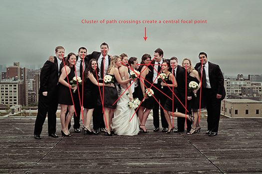 In this group photo, I positioned each of their heads to draw your eye to where the bride and groom are standing. I did this without being too obvious about the pattern. The key is to trick the viewer into thinking there’s no pattern, or there must be just enough randomness within the pose to confuse the brain. And there must be enough intention and organization to draw the viewer’s attention right to where you want it. It is a sensitive balancing act. To draw the viewer’s attention to the bride and groom, I began to cross the nose paths of the people surrounding them. People subconsciously look where others are pointing or facing, so I’m using this to my advantage. Because the people at the edges of the photo are turned toward the camera, the nose path crossings are confined to the middle where the bride and groom are standing. This subtlety puts the viewer’s attention where you want it—on the bride and groom. (Still confused? All I do is create a cluster of path crossings zigzagging around my main subjects. Then I simply break that zigzag pattern, usually at the edges.)